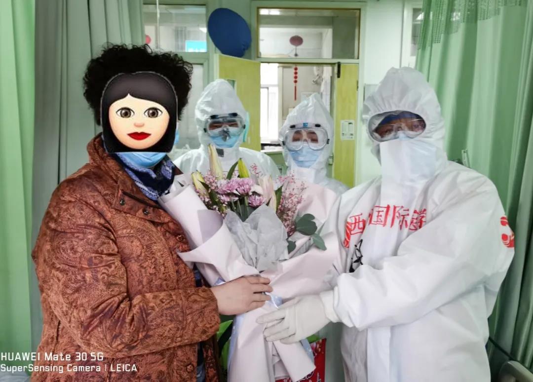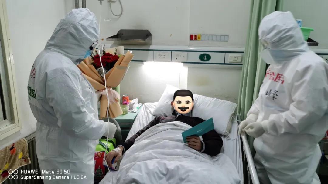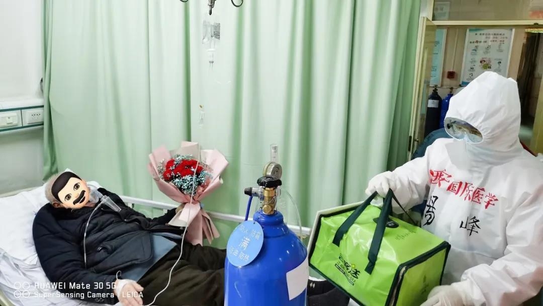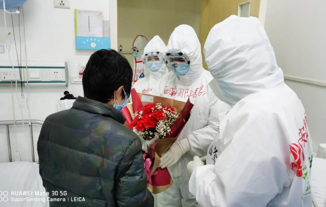 醫(yī)護(hù)人員為59歲患者袁某某送上鮮花