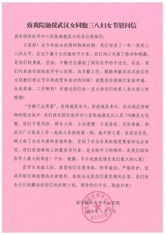 “疫”線有我,做“逆行先鋒”。疫情發(fā)生正值春節(jié)假期,西安國(guó)際醫(yī)學(xué)中心醫(yī)院從全面部署防控工作到建立聯(lián)防聯(lián)控工作機(jī)制,從醫(yī)療隊(duì)員火速馳援到醫(yī)療物資緊急保障,從正式進(jìn)駐武漢第八醫(yī)院和隨州市中心醫(yī)院到全面接收新冠患者……都有女隊(duì)員們不懼危險(xiǎn)、日夜奮戰(zhàn),同時(shí)間賽跑,與病魔較量的身影。2月2日,接陜西省衛(wèi)健委馳援武漢的指令,5個(gè)小時(shí),1000余名女醫(yī)護(hù)人員主動(dòng)請(qǐng)纓,遞交了請(qǐng)戰(zhàn)書(shū)、紅手印。腫瘤醫(yī)院副院長(zhǎng)薛妍教授、感控部主任劉冰、總護(hù)士長(zhǎng)倪曉慧等醫(yī)護(hù)人員舍小家、為大家,迅速出擊、臨危不懼,不計(jì)名利、不顧生死,于2月3日搭乘包機(jī)到達(dá)指定地點(diǎn),令人肅然起敬,令人敬佩感動(dòng)。