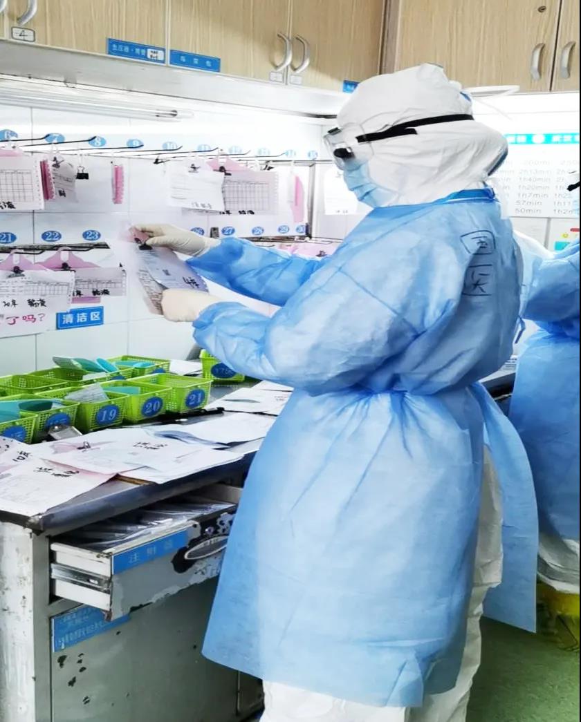 一線臨床的治療和護(hù)理工作,是真正考驗(yàn)技術(shù)的環(huán)節(jié)。加藥配藥嚴(yán)格無(wú)菌操作、雙人核對(duì)。戴著多層防護(hù)手套工作,一雙“大手”小心翼翼拿取每一小支安瓿抽吸藥液時(shí)稍顯笨拙,但是護(hù)士說(shuō):“現(xiàn)在加藥的姿勢(shì)可能有點(diǎn)狼狽,但是我沒有浪費(fèi)一滴藥,這都是在科室練出來(lái)的基本功?!?/span>