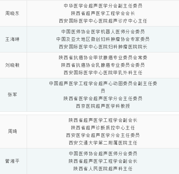 本次義診的醫(yī)護(hù)團(tuán)隊(duì)陣容不僅專(zhuān)業(yè)面廣而且水平高,僅超聲科就聚集了西安市各大醫(yī)院的超聲科主任一起深入基層為平利的女同胞們義診。他們是: