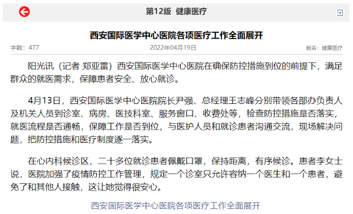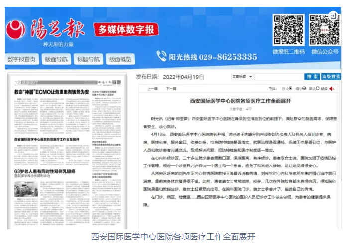 陽(yáng)光報(bào):西安國(guó)際醫(yī)學(xué)中心醫(yī)院各項(xiàng)醫(yī)療工作全面展開(kāi)