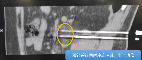 這個(gè)患者病變位置刁鉆,穿刺難度大,冷凍消融的難點(diǎn)在于既要不損傷膈肌和肺組織,同時(shí)又要盡最大可能完全消融腫瘤。術(shù)前陳寶瑩主任、李鐵柱教授、兀云飛醫(yī)生詳細(xì)設(shè)計(jì)進(jìn)針路徑、布針計(jì)劃,術(shù)中微創(chuàng)團(tuán)隊(duì)協(xié)調(diào)配合,李鐵柱教授仔細(xì)操作,精準(zhǔn)到位,順利完成兩個(gè)病變的布針,遂啟動(dòng)治療,先快速降溫到-150多度,再升溫至15?,經(jīng)過兩個(gè)循環(huán)反復(fù),即刻觀察到病變完全被冰球覆蓋,同時(shí)周圍臟器無損傷,術(shù)中患者幾乎沒有疼痛,還和醫(yī)生聊起了天。