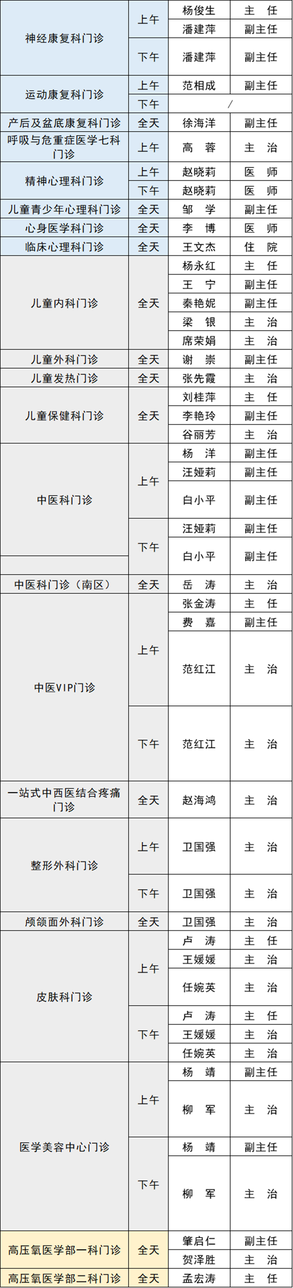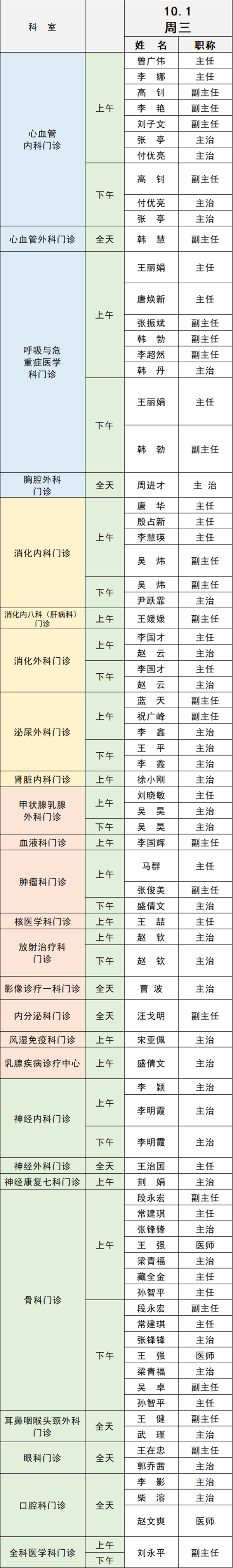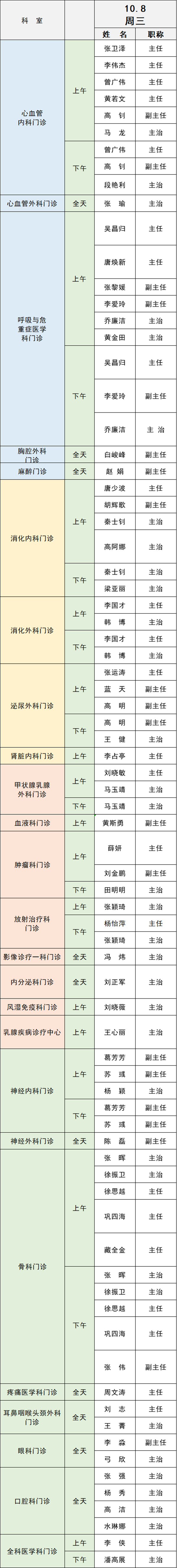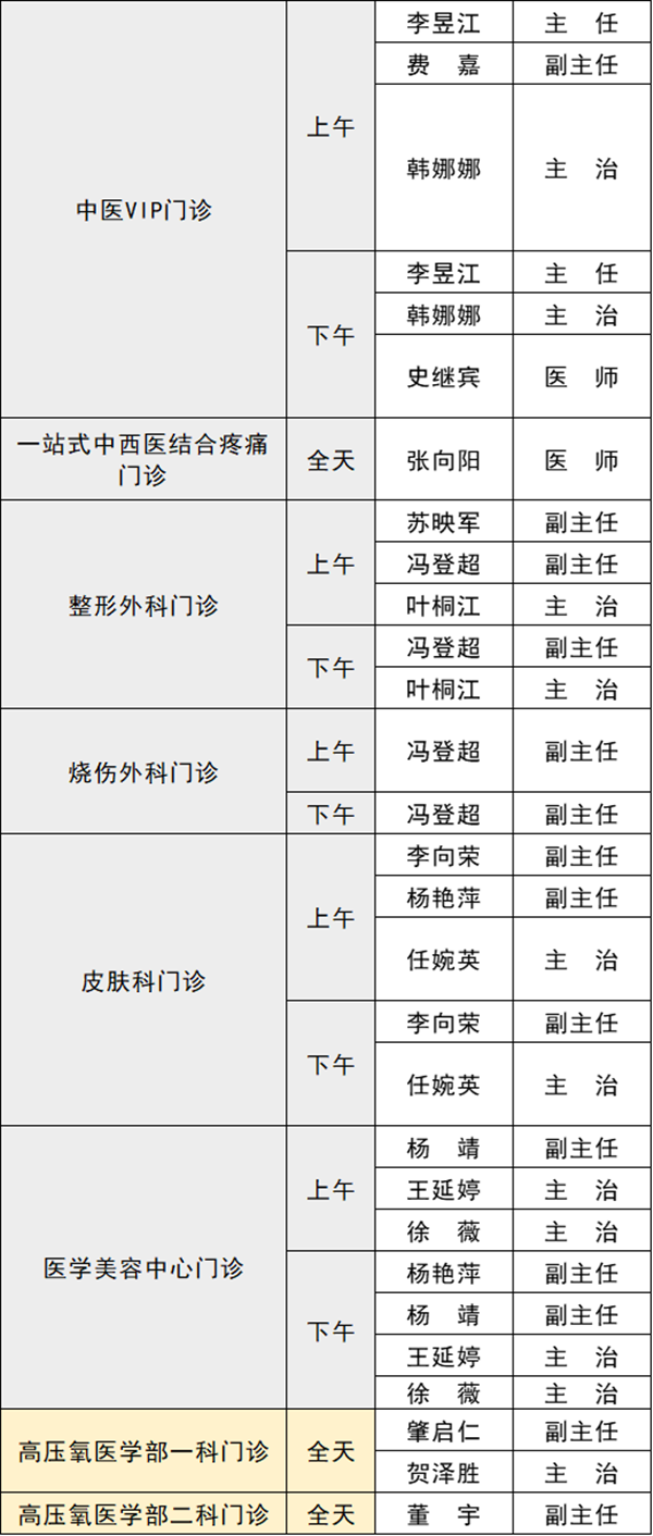 備注:實際出診情況以醫(yī)院掛號平臺實時信息為準(zhǔn)。“職稱”欄里主任=主任醫(yī)師副主任=副主任醫(yī)師主治=主治醫(yī)師