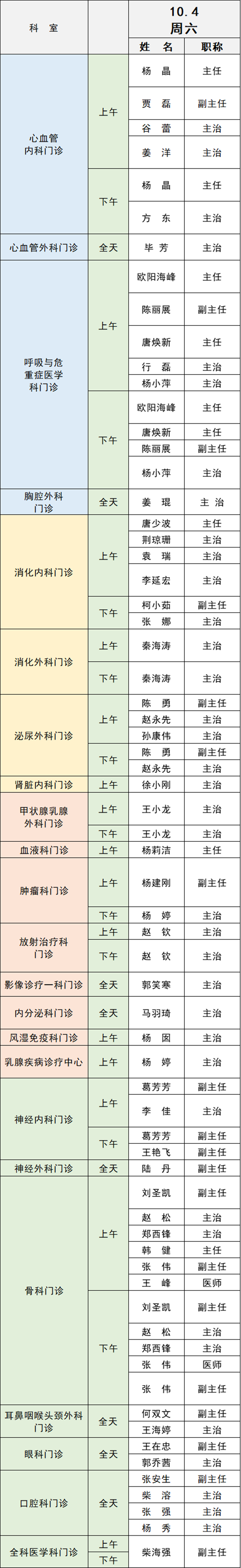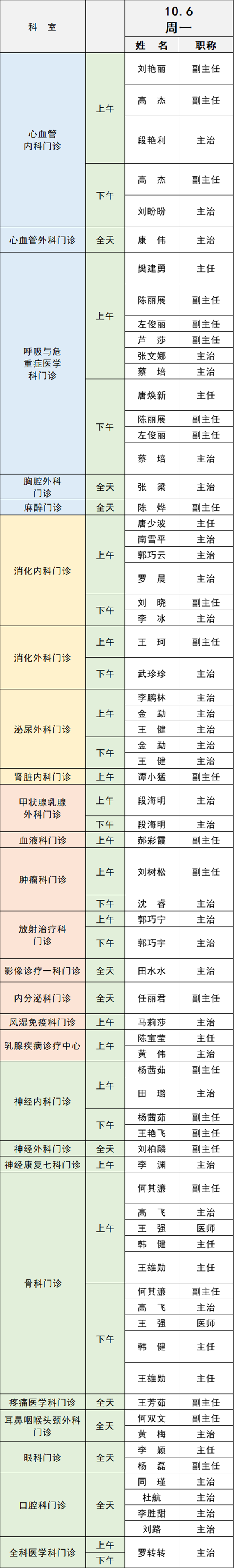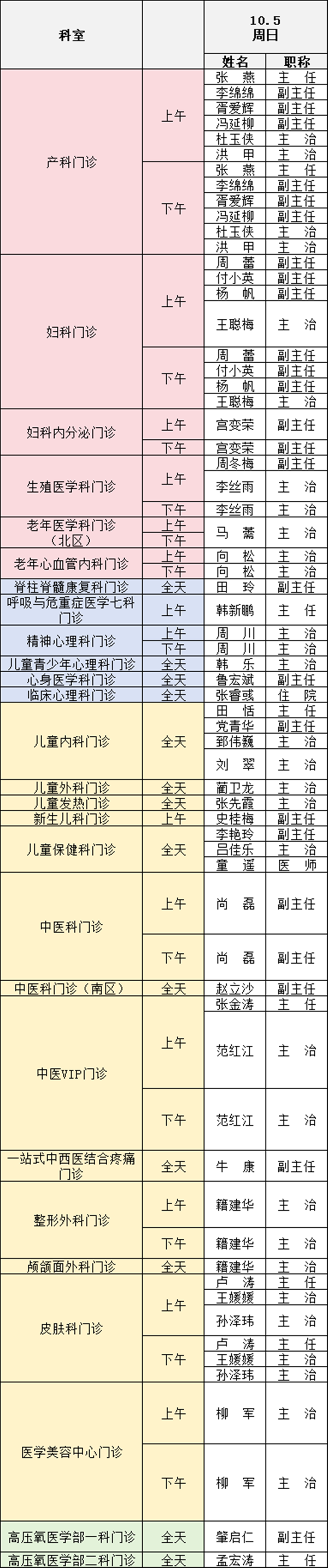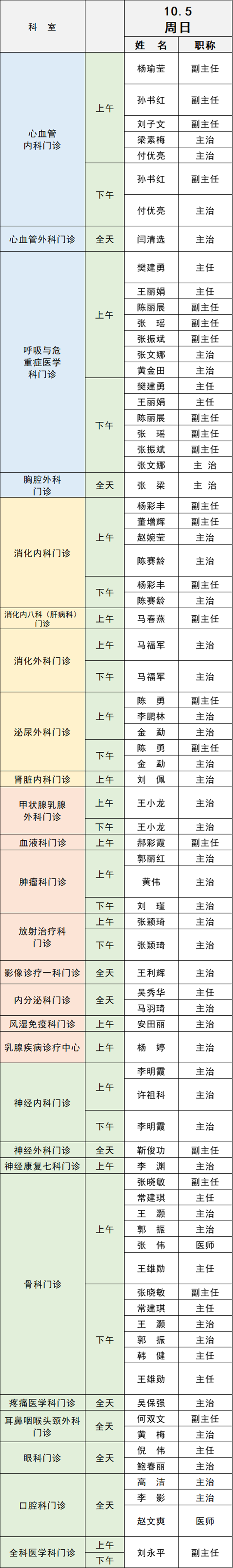 備注:實際出診情況以醫(yī)院掛號平臺實時信息為準(zhǔn)。“職稱”欄里主任=主任醫(yī)師副主任=副主任醫(yī)師主治=主治醫(yī)師