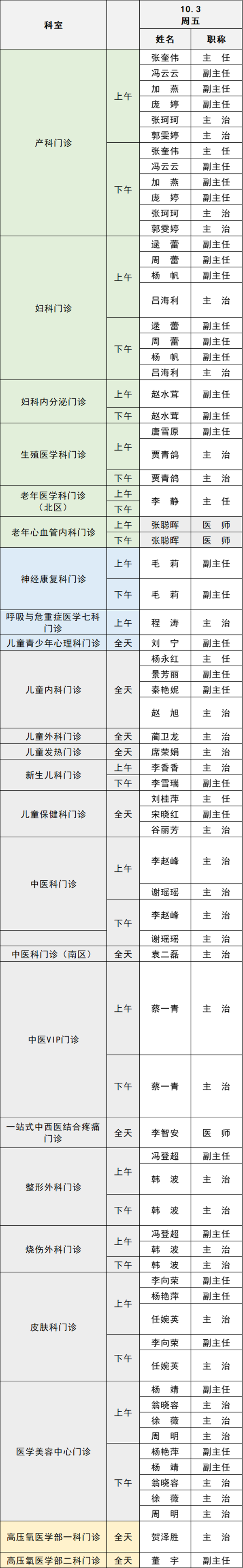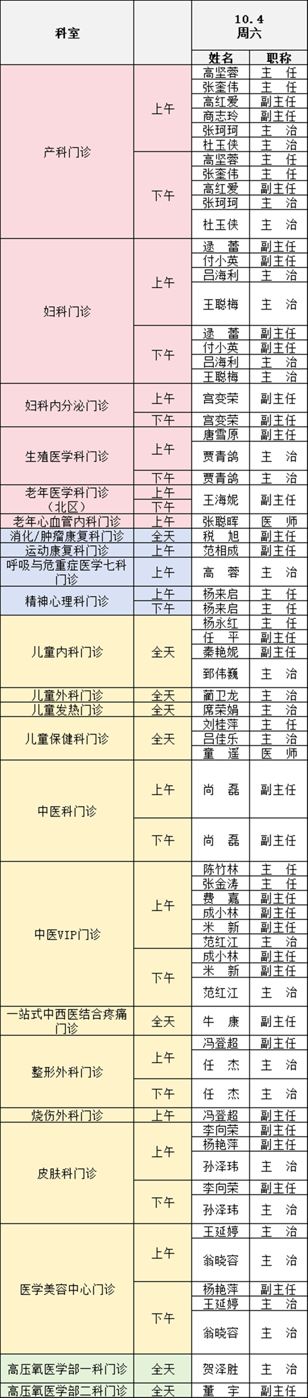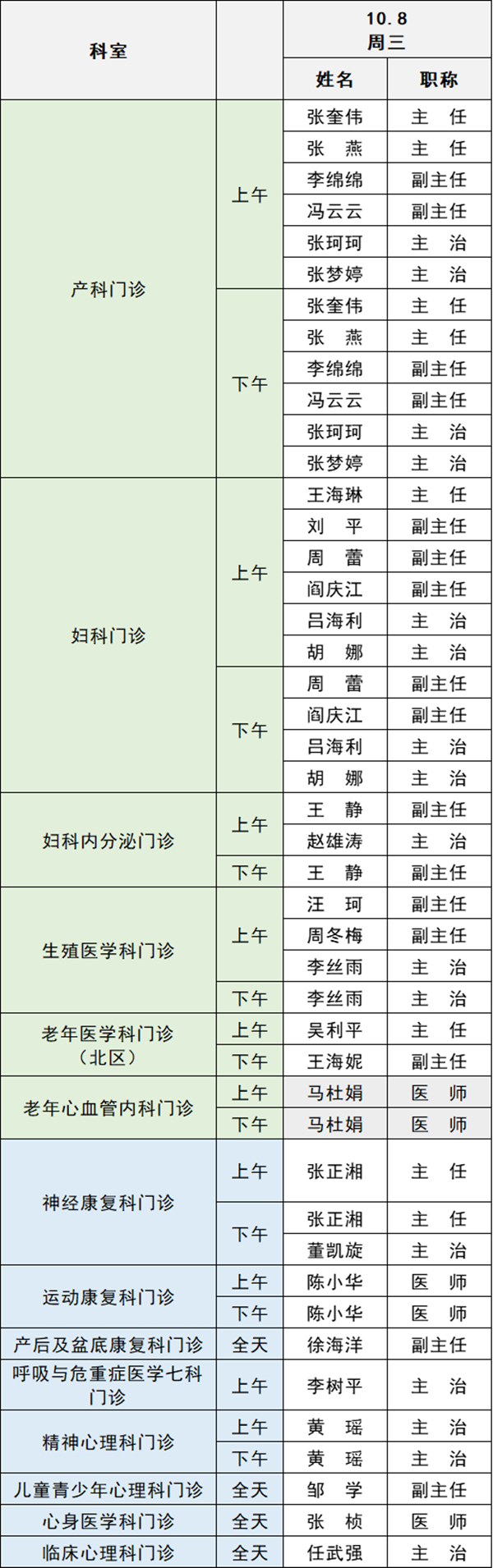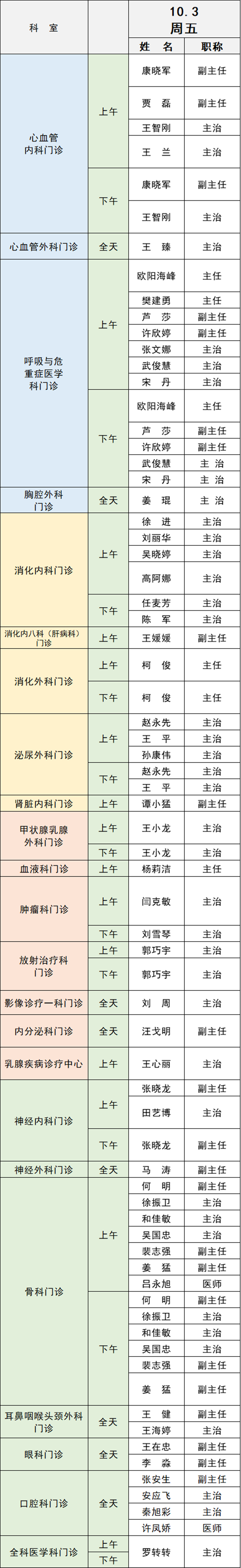 備注:實際出診情況以醫(yī)院掛號平臺實時信息為準(zhǔn)。“職稱”欄里主任=主任醫(yī)師副主任=副主任醫(yī)師主治=主治醫(yī)師